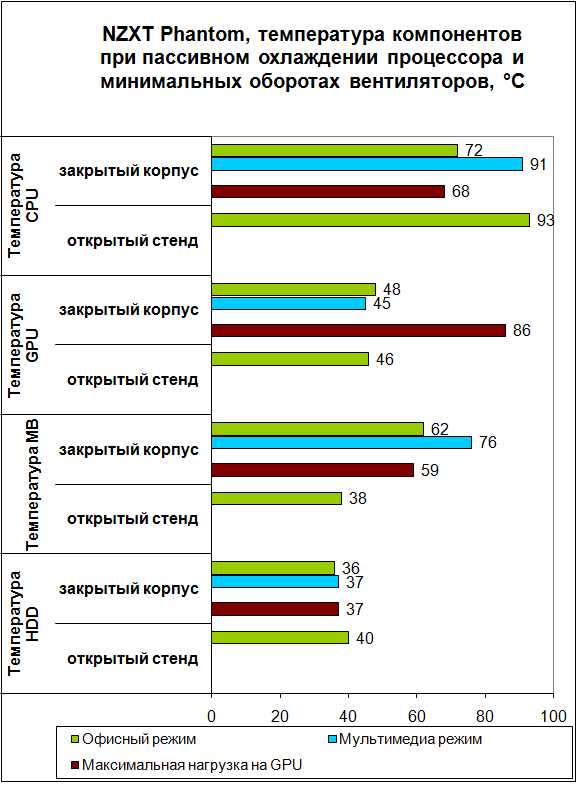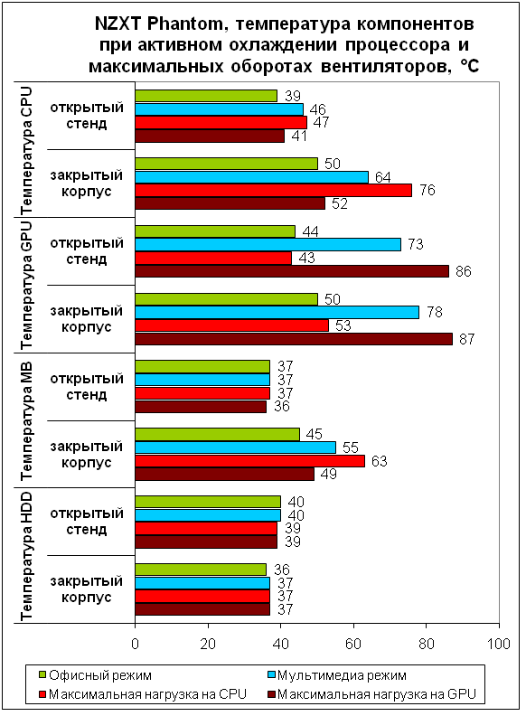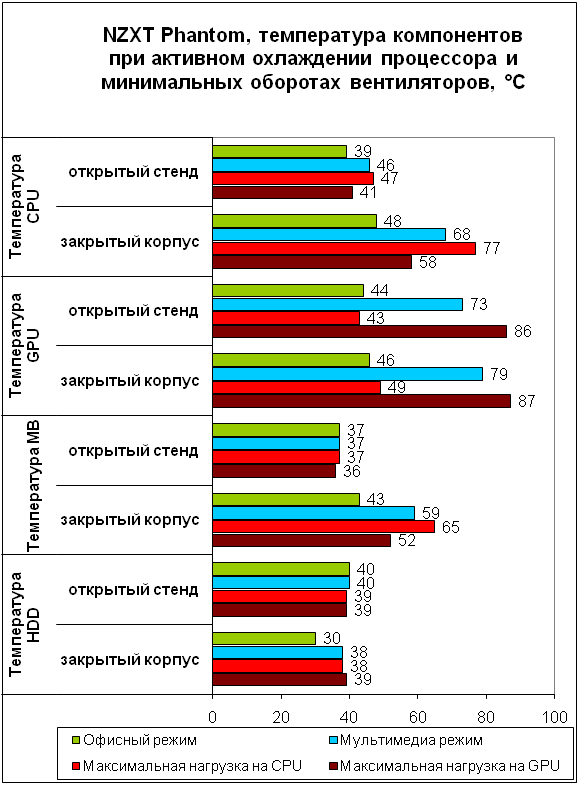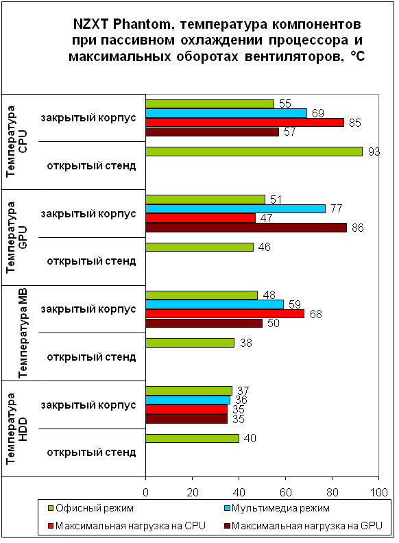 Система охлаждения, работающая в полную силу, не показывает выдающихся результатов. Лишь температуры жесткого диска в корпусе ниже аналогичных показателей для открытого стенда – 120-мм вентиляторы на боковой стенке установлены действительно не зря. Видеокарта внутри корпуса горячее в среднем на пять градусов, а процессору еще менее комфортно – в режиме максимальной нагрузки предельная рабочая температура, заявленная производителем, превышена на 12 градусов.