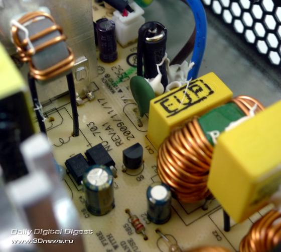 Внутреннюю компоновку блока питания можно назвать достаточно простой и незамысловатой. В первичной цепи применён один электролитический конденсатор номиналом 220 мкФ х 450 В. Монтаж и пайка элементов схемы выполнены опрятно и качественно, крупногабаритные элементы схемы добросовестно закреплены, дополнительная изоляция имеется во всех необходимых местах.