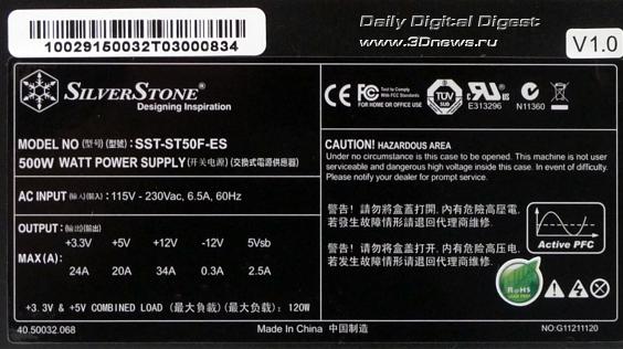 Поставляемый в комплекте с корпусом блок питания имеет маркировку SilverStone Technology SST-ST50F-ES. Представители этого семейства – Strider, уже тестировались в нашей лаборатории, см. статьи "Модульные блоки питания SilverStone Strider ST60F и ST75F" и "Модульный БП SilverStone Strider SST-ST50F-230 мощностью 500 Вт", однако стоит отметить, что рассматриваемый сегодня БП имеет мало общего с вышеупомянутыми моделями.
