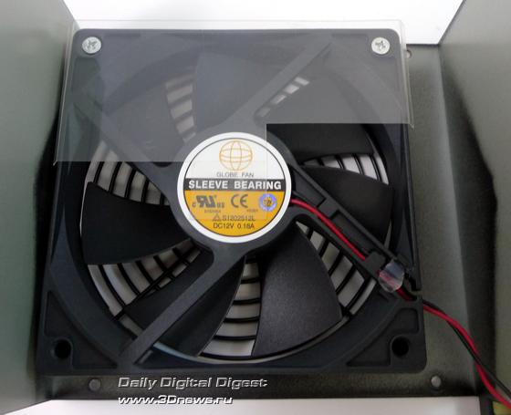 Второй вентилятор находится на съемном ребре жесткости. Это еще одна «восьмидесятка», и она тоже гонит холодный воздух внутрь корпуса – туда, где находится видеокарта. Работают оба вентилятора негромко – за шумом системы охлаждения процессора, видеокарты и блока питания их вообще не слышно.