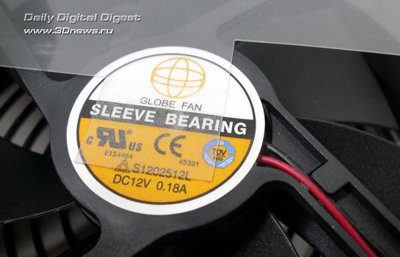 Заглянем внутрь блока питания. Модель SilverStone SST-ST50F-ES оснащена безщёточным 120-мм вентилятором S1202512L производства компании Globe Fan (12 В, 0,18 А) на подшипниках скольжения, в отличие от старших моделей с вентиляторами на подшипниках качения. Вентилятор подключен в схему 2-контактным разъёмом. Внутренние охлаждающие потоки воздуха формируются с помощью прозрачной пластиковой накладки, закрывающей часть лопастей вентилятора.
