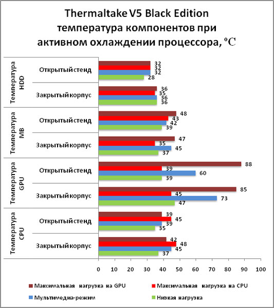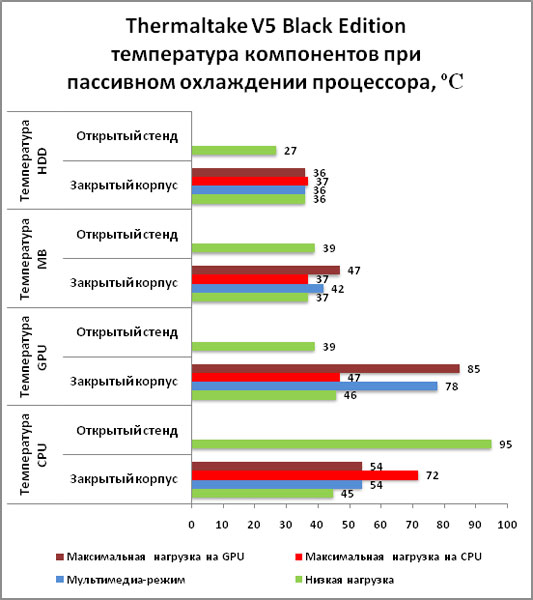 При пассивном охлаждении процессора результаты тоже оказываются вполне приятными: 72 градуса после часового прогона Linpack в отсутствие вентилятора на кулере - это просто здорово. В остальном, все почти так же, разве что жесткий диск греется еще немного сильнее - видимо, вентилятор на процессоре увеличивал воздушный поток сквозь корпус. Но если сравнить температуры компонентов в Thermaltake V5 Black Edition с температурами открытого стенда, который в при пассивном охлаждении не проходит ни одного теста, то корпус можно только похвалить.