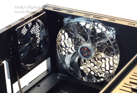 Зато в корпусе предусмотрены посадочные места для двух дополнительных 120-мм вентиляторов, вдувающих воздух в корпус. Одно такое место находится на передней стороне корзины для жестких дисков: вентилятор крепится туда при помощи специальных креплений из комплекта. Если в корзину будут установлены все три жестких диска, то они значительно ослабят входящий поток воздуха в корпусе и снизят эффективность охлаждения. Еще одно посадочное место располагается на левой боковой стенке корпуса чуть ниже прозрачного окна. Среди многочисленных шестиугольных вентиляционных отверстий можно найти четыре отверстия для крепления 120-мм вентилятора, который, по задумке производителя, должен обдувать видеокарту, тем самым значительно снижая ее температуру. Установка дополнительного кулера будет актуальна только в случае видеокарты, система охлаждения которой не прикрыта пластиковым кожухом. В противном случае, вентилятор будет только создавать турбулентности, снижая скорость воздушного потока в корпусе и, соответственно, повышая температуру компонентов.