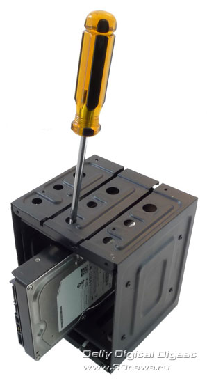 Зачем именно в данном случае нужны безвинтовые крепления - неизвестно: жесткие диски все равно придется привинчивать по старинке - винтами. Закручивать винты без магнитной отвертки катастрофически неудобно - места для них расположены в углублениях, до которых пальцами дотянуться невозможно. Никакой виброизоляции в корзине нет, все вибрации будут передаваться на корпус и усиливаться им.