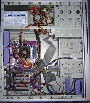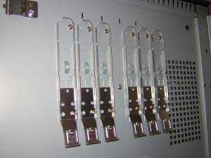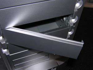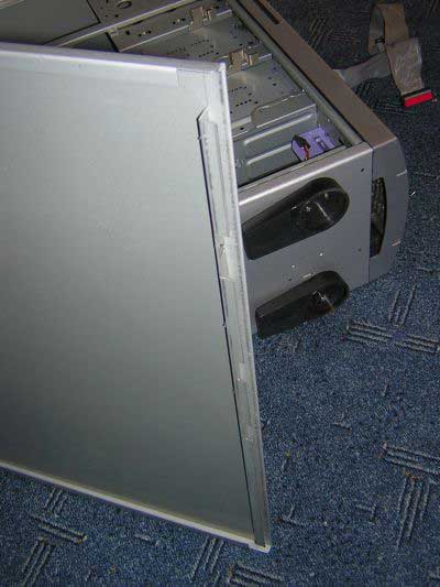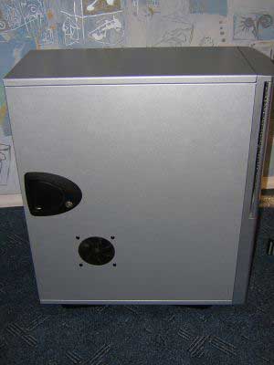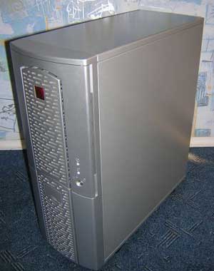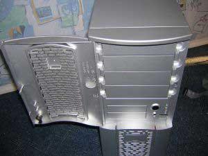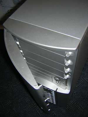 Считаю необходимым прокомментировать некоторые пункты. Как видите, размеры корпуса действительно внушающие! Особенно сильно выделяется высота в 53 сантиметра. Материал корпуса заслуживает пристального внимания. Когда ты осматриваешь бюджетные корпус, на многое закрываешь глаза, не замечаешь многие не самые удачные ракурсы. Мол, "ну и ладно, зато цена красивая!". Когда же осматриваешь достойнейших из достойных, внимание следует обращать на ВСЁ - критерии будут более строгими и то, на что не обращал внимание в менее дорогом корпусе, должно вызывать реакцию. Положительную, или отрицательную - полностью зависит от осматриваемой модели. Кстати, по спецификациям, разработанным давным-давно, толщина стенок корпуса не должна быть менее 1 миллиметра - это минимально приемлемая величина для того, чтобы корпус не пропускал излучение. Лучевой фактор не единственный - важно понимать, что тонкие стенки будут больше вибрировать, а, значит, увеличится "шумовое загрязнение" окружающего пространства. В общем, мы углубляемся в не самую приятную штуку, под общим названием "уход от темы". Так вот, толщина стенок MX01SLD-U составляет 1,3 миллиметра! К слову, это сделало стенки такими же неподъемными, как и сам корпус.:)  Далее, 4 отсека для 5,25"-приводов, это уже не стандартная величина - обычно их три. Большее количество говорит о более просторном корпусе. 4 внутренних отсека 3,5" нам ещё предстоит поругать в пункте "корпус внутри", так что не будем забегать вперед. Ну, и количество мест для посадки вентиляторов говорит о продуманности воздушного потока. В комплекте с корпусом шли: набор винтиков и позолоченных креплений для материнской платы, рельсы для приводов CD-ROM, 4 вентилятора 80х80, установленные на свои места, а также, 4 ключа для запирающих механизмов. Внешний вид Наш вариант корпуса был покрашен в серебристый цвет ("серый металлик"), хотя доступны модификации с более светлыми и темными тонами. На мой взгляд, серебристый металлик наиболее четко передает веяния моды нашего времени - напористый, резкий, сверкающий. Цвет корпуса может натолкнуть некоторых индивидуумов на мысль о том, что корпус алюминиевый, но это не так! Как я и писал выше - корпус полностью выполнен из стали. Хотя нет, не полностью - округлая накладка на переднюю панель пластиковая. MX01SLD-U относится к серии моделей с крышками, прикрывающими все кнопки управления питанием и приводы 5,25" / 3,5". У данного решения есть и плюсы и минусы. Так, например, крышка может повредить ваш CD/DVD-ROM - если она будет закрыта, а привод решит выдвинуть каретку (согласитесь, такое бывает довольно часто), но не сможет - несколько раз, и подшипник износится, а привод придется заменить. Здесь все, конечно, несколько утрировано, но суть вы поняли. Плюс, из субъективных минусов - вам каждый раз придется открывать / закрывать крышку при желании получить доступ к любым функциям компьютера, скрывающимся под ней. Ещё один негативный вариант, но касаемо крышки нашего корпуса в частности - она сама и её шарниры пластиковые. Если вы случайно их сломаете (мало ли что случается) корпус потеряет добрую половину эстетических свойств и станет "просто корпусом", а не "железной крепостью". Плюсы крышки также весьма существенны - они могут уберегать "жизненно опасные" кнопки от несанкционированного нажатия ребенком, пробегающим мимо. Ругать любимое чад