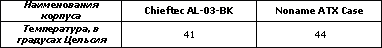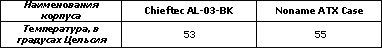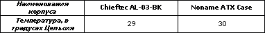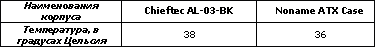 Полученные результаты. Температура процессора Данные результаты были получены при замере температуры в спокойном состоянии, т.е. без особенной нагрузки на центральный процессор. Замер производился посредствам программы Everest, коммерческой версии утилиты AIDA32. Далее результаты, полученные, после получаса использования утилиты CPUBurn BurnK7:  Уже на первом тесте заметно, что Chieftec обходит по результатам дешевые китайские аналоги, чего и следовало ожидать. С другой стороны, отставание является не таким уж критичным - видимо, причиной тому является отсутствие какого-либо вентилятора на передней панели корпуса, а значит отсутствие правильного, направленного потока воздуха, проходящего через всю внутреннюю полость. Также, немалую роль в этом может играть большая концентрация проводов, отходящих от материнской платы и блока питания к различным устройствам системы.  Полученные результаты. Температура северного моста  Похожая, если не сказать аналогичная предыдущему тесту, ситуация. То же самое относится и к результатам, полученным при использовании утилиты для быстрого "разогрева" системы CPUBurn BurnK7. Полученные результаты. Температура жесткого диска  Удивлены? Не стоит удивляться… Причиной своеобразного результата, является не только отсутствие воздухопотока внутри корпуса, но и инновационное положение корзины для жестких дисков. По нашему мнению, основная причина заключается именно в этом, хотя мы можем и ошибаться… Шумовые характеристики? Как правило, инженеры Chieftec уделяют этому параметру большое количество своего внимания и сводят шумовые характеристики рабочей системы внутри корпуса практически к нулю. AL-03-BK, почему-то, оказался обделенным этого внимания. :( Несомненно, качественная и толстая сталь корпуса несколько снижают шум исходящий от компонентов системы в рабочем состоянии, но этого явно недостаточно для уровня Chieftec. Вот такая ложка дегтя в самом конце обзора. ВыводыПреимущества: