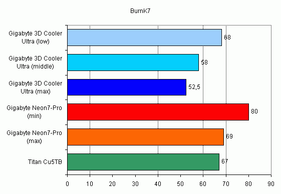 Итак, даже на минимальной скорости кулер Neon7-Pro справляется с хорошо разогнанным процессором Barton. В более скоростных (и более шумных) режимах он почти сравнялся с популярным медным кулером Titan Cu5TB. Что касается сравнения с кулером Gigabyte 3D Cooler, то тут не может быть никакого сравнения :). Это совершенно разные весовые категории: на минимальной скорости 3D Cooler охлаждает лучше, чем Neon7-Pro на максимальной.