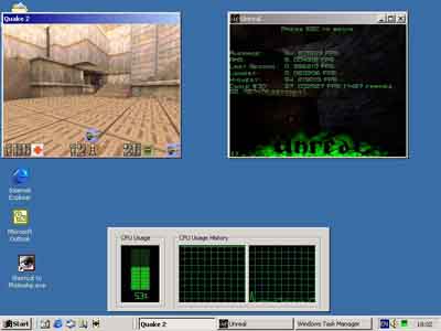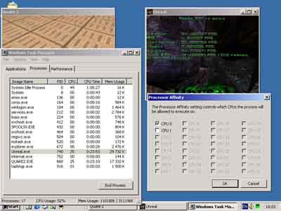 Однако, выше речь шла о софте, при написании которого специально учитывалась возможность его работы на SMP cистемах, в то время как большинство современных программ не имеют такой оптимизации. Возникает резонный вопрос: есть ли смысл ставить многопроцессорную машину, ведь ее преимущества будут ощутимы только в ограниченном числе приложений? Ответ: да. В любом случае, многопроцессорная машина аппаратно приспособлена для реализации многозадачности (помните правило: один процессор – одна нить?), и при работе нескольких приложений ее преимущество над однопроцессорным собратом должно быть значительным. Какой же должна быть методика тестирования, чтобы доказать это практически? Во-первых, нужно запустить несколько приложений, которые не дают значительного прироста от использования SMP-системы, но сильно загружают процессор. Во-вторых, эти приложения должны обеспечивать возможность подсчета производительности. И, наконец, было бы неплохо, что бы они были достаточно популярными, и любой желающий, мог самостоятельно проверить истинность наших выкладок. Мы выбрали две игры, которые наиболее полно соответствуют всем этим критериям - Quake2 и Unreal. Конечно, никто не будет играть в две игры одновременно, но на их примере, можно выявить тенденцию, которая будет верна практически для любых других процессороемких приложений, от MP3-encoder до DVD-player. Тестирование проводилось следующим образом. В двух окнах – fullscreen off - запускался Quake2 и Unreal, в каждом из них запускался timedemo. Разрешение 320x240, Software rendering (как вы помните, выяснялась производительность процессоров, а не видеокарты). Потом замерялись результаты. После этого, в Task Manager командой Set Affinity оба приложения вешались на один процессор, и снова замерялось timedemo.