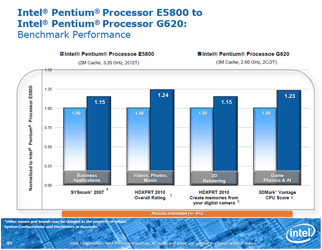 Новые Pentium G850/G840/G620 приходят на смену процессорам Pentium E6000/E5000 для LGA775-систем и LGA1156-процессорам Pentium G6960/G6960. Надо сказать, что при сопоставлении между собой их характеристик новинки выглядят не слишком убедительно. Старые процессоры имеют более высокие тактовые частоты. Но в данном случае это компенсируется новой микроархитектурой Sandy Bridge, обеспечивающей исполнение большего числа команд за один такт. Кроме того, серьёзным плюсом Pentium G850/G840/G620 является поддержка ими производительных модификаций DDR3-памяти, которой ранее в процессорах такого класса не было. Всё это позволяет Intel утверждать, что новые Pentium превосходят по реальному быстродействию старые как минимум на 15-25 %.