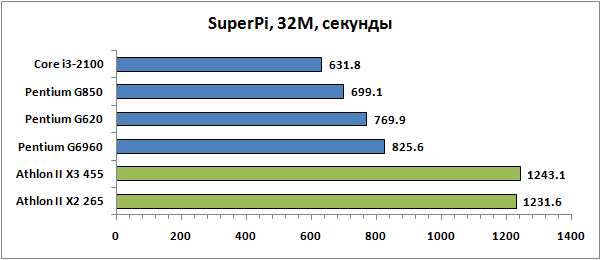 А вот в противостоянии с процессорами AMD такой однозначности нет. Pentium G620 опережает Athlon II X2 265 далеко не всегда. Можно даже сказать, что между этими процессорами установился некий паритет, за исключением разве только SuperPi, где представители семейства Pentium выступили с феноменально высоким результатом. Athlon II X3 455 же оказывается мощным конкурентом даже для старшего из новых Pentium. Его три ядра гарантируют сокрушительное преимущество в том случае, если приложение хорошо оптимизировано под многопоточность. В отсутствие же явной оптимизации Pentium G850 и Athlon II X3455 демонстрируют примерно равное быстродействие.