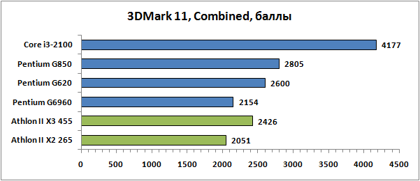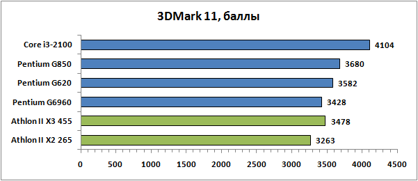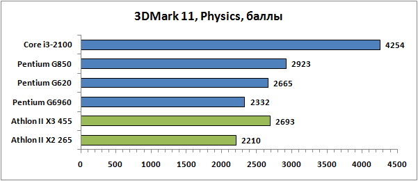 Показатели быстродействия, полученные нами в популярных пакетах серии 3DMark, хочется выделить особо. Это всё-таки не реальные игры, а некие синтетические тесты, их моделирующие. Причём выполняющие это с явным перекосом в пользу интеловских процессоров, так как результаты Athlon II тут явно не сходятся с тем, что мы видели ранее. Даже полноценному трёхъядерному Athlon II X3 455 здесь не удаётся опередить новые Pentium, располагающие всего лишь двумя ядрами и не поддерживающие Hyper-Threading.