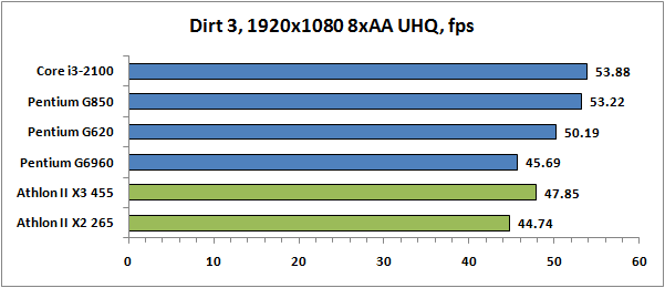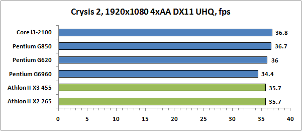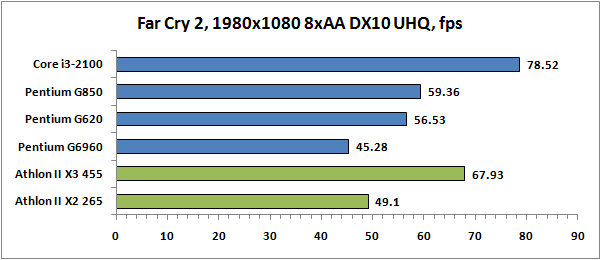 В реальных игровых приложениях результаты распределились иначе. Если процессоры Core второго поколения выглядели как превосходное геймерское решение, то про Pentium это сказать можно далеко не всегда. Уж слишком сильно Pentium отстают от своих старших собратьев. Это приводит к тому, что в некоторых случаях лучшую игровую производительность могут показывать и Athlon II X3. Очевидно, происходит это тогда, когда та или иная игра имеет качественную оптимизацию под многопоточность.