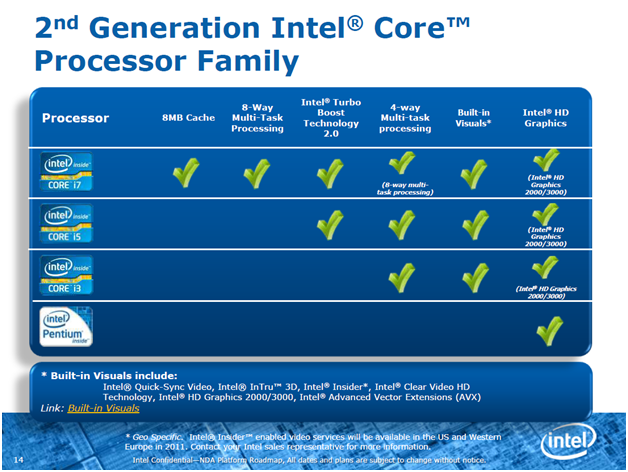 Так же и сейчас: новые Pentium в LGA1155-исполнении, подобно полноценным процессорам Core второго поколения, базируются на современной микроархитектуре Sandy Bridge, но их цены — ниже. В то же время Pentium — это и не Celeron, которые будут стоить ещё дешевле.