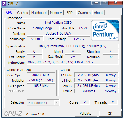 | Pentium G850 | 2/2 | 2,9 | 3 | 850/1100 | 65 |