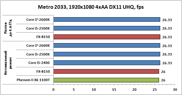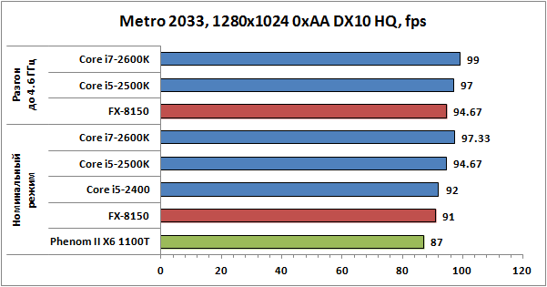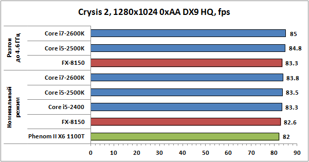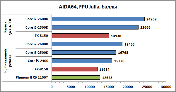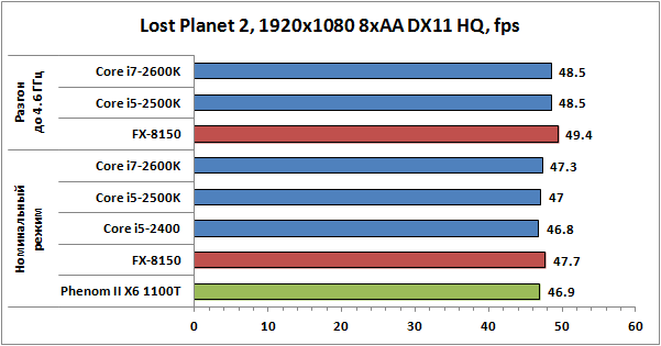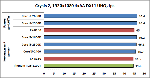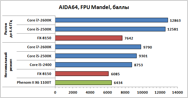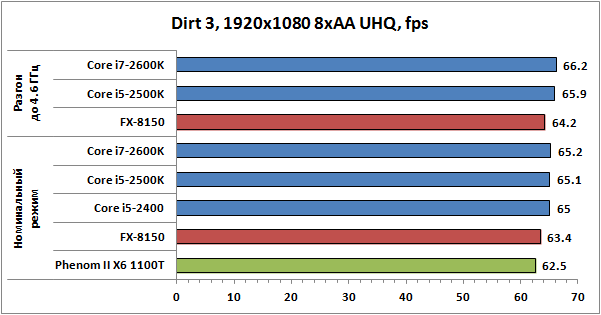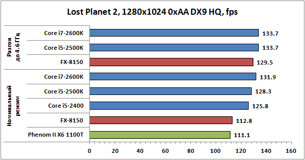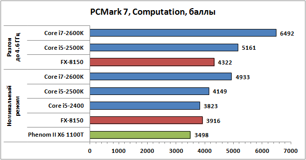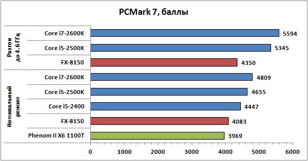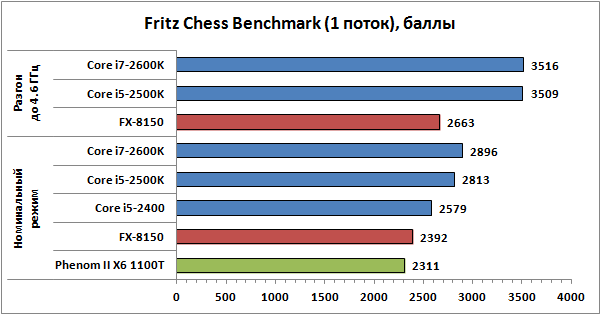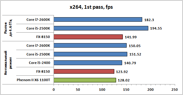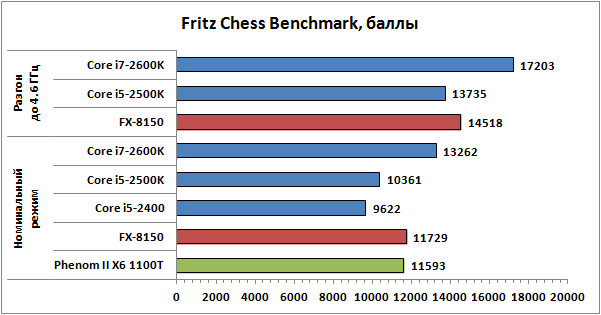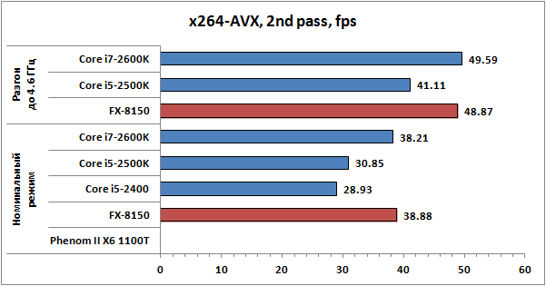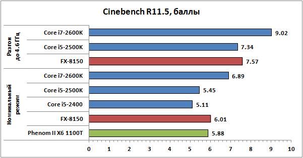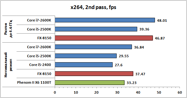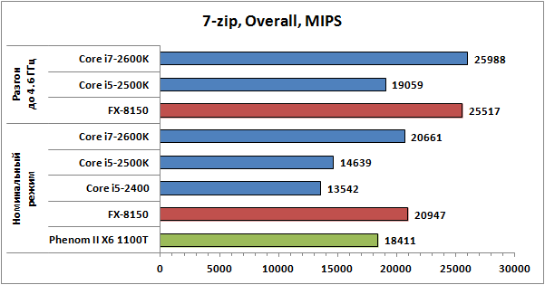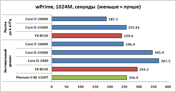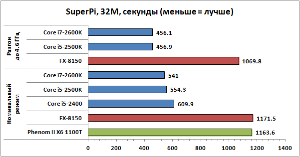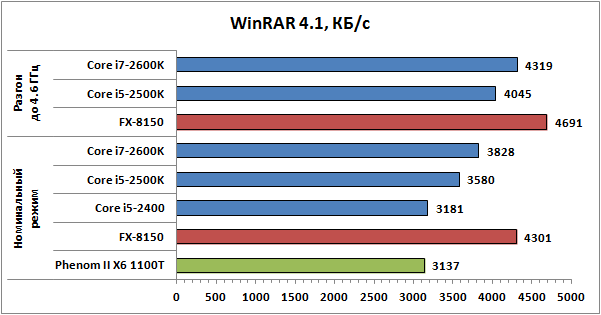 Неплохой и сравнительно простой разгон процессоров AMD FX — это их неотъемлемая и важная черта, поэтому далее тестирование производительности FX-8150 проводилось дважды — в номинальном режиме и при описанном 4,6-гигагерцевом разгоне. Соответственно, противопоставлялись такому разогнанному Bulldozer разогнанные же процессоры Core i7-2600K и Core i5-2500K, частота работы которых была доведена до тех же 4,6 ГГц.