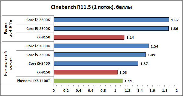 | Cinebench R11,5,баллы | 6.01 | 6.02 | 0,2 % |