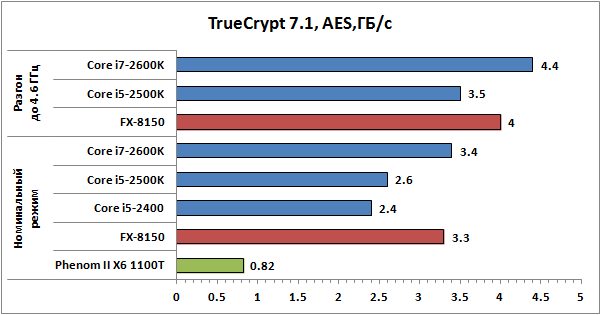 Поддержка AES в Bulldozer находится на хорошем уровне. При шифровании FX-8150 показывает себя на равне с Core i7-2600K.