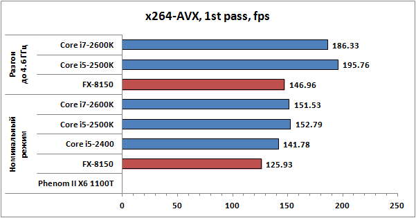 Включение новых инструкций позволило поднять скорость работы кодека примерно на 4 % как для процессоров AMD, так и для их интеловских конкурентов (речь идёт о результатах второго прохода). Общая же картина осталась в целом той же, что и при использовании стандартной версии x264, не задействующей AVX.