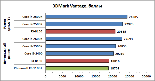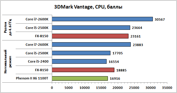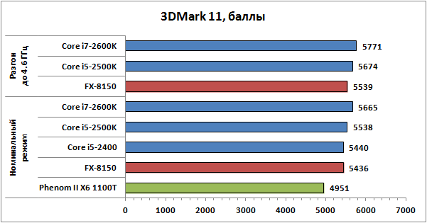 Несмотря на то, что процессорные тесты из 3DMark активно задействуют многопоточность, результаты FX-8150 далеко не так хороши, как в чисто вычислительных многопоточных бенчмарках. Общий же индекс производительности, выдаваемый в обеих версиях 3DMark, и того хуже — более высоким быстродействием обладает даже Core i5-2400.