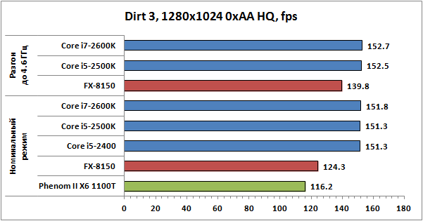 В заключительной части тестирования FX-8150 потерпел фиаско. Даже те игры, где заявлено активное использование любого числа процессорных ядер, делают это не столь эффективно, чтобы FX-8150 удалось хоть где-то ощутимо выиграть. Флагманский процессор AMD в целом обеспечивает более низкую, чем Core i5 и Core i7, производительность, но от разгрома его спасает видеокарта, которая зачастую выступает "бутылочным горлышком" и не даёт в полной мере раскрыться процессорной производительности.