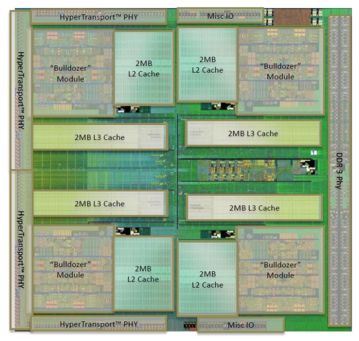 Все процессоры AMD FX основываются на таком полупроводниковом кристалле с четырьмя модулями, состоящем из 2 млрд транзисторов