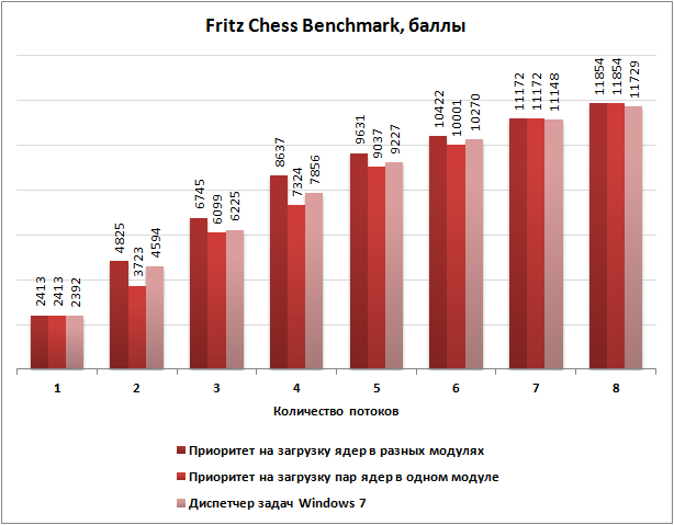 Для проверки удачности в этом плане диспетчера задач Windows 7 мы на примере шахматного бенчмарка Fritz провели небольшое исследование, в рамках которого обратили внимание на производительность системы при различном количестве вычислительных потоков, которые назначаются по ядрам в автономном режиме. Параллельно аналогичное тестирование проводилось и в том случае, когда диспетчер задач от распределения нагрузки был освобождён. При этом его роль мы брали на себя и действовал в соответствии с двумя различными стратегиями: либо в первую назначали нагрузку на ядра, находящиеся в разных модулях; либо, напротив, сначала задействовали ядра одного модуля, а только потом переключались на следующий.