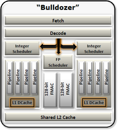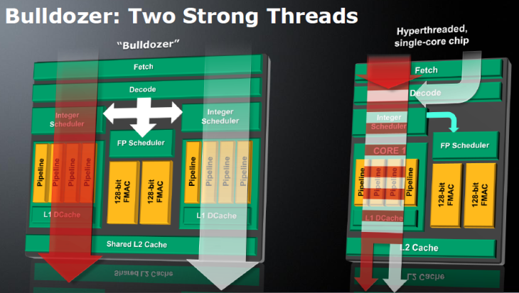 Однако свои самые сильные стороны модуль Bulldozer должен проявлять при двухпоточной нагрузке. Одно ядро Sandy Bridge тоже способно обрабатывать два вычислительных потока, для этого в нём имеется технология Hyper-Threading. Однако все инструкции при этом направляются на один набор исполнительных устройств, что на практике вызывает многочисленные коллизии. В модуле Bulldozer же сохранено два независимых целочисленных кластера, которые могут исполнять потоки параллельно, а суммарное количество исполнительных устройств в них превышает число таких устройств в ядре Sandy Bridge в полтора раза.