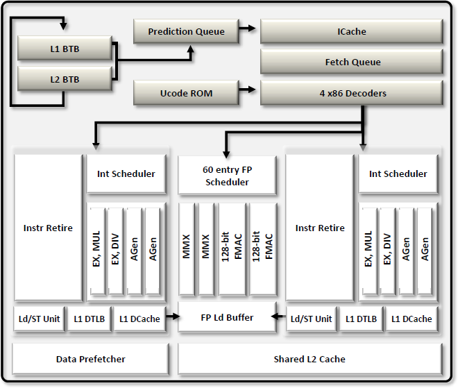 При этом речь идёт совсем не о примитивном совмещении на одном полупроводниковом кристалле восьми простых ядер. При таком раскладе получившийся процессор обладал бы совсем невысокой однопоточной производительностью, и это стало бы достаточно серьёзной проблемой, так как программ, не дробящих нагрузку на несколько вычислительных потоков, не так уж и мало. Поэтому, во-первых, ядра были оптимизированы под работу на высоких тактовых частотах. А во-вторых, они были спарены в двухъядерные модули, способные совместно использовать свои ресурсы во благо обслуживания одного потока. В итоге получилась достаточно любопытная конструкция: входная часть исполнительного конвейера у такого двухъядерного модуля — общая, а в дальнейшем обработка инструкций делится между двумя наборами исполнительных устройств.