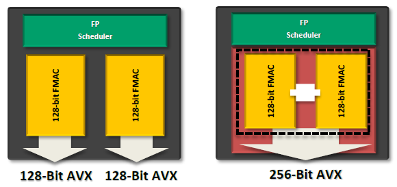 Аналогичная идея объединения 128-битных устройств для работы с 256-битными инструкциями используется и в Sandy Bridge
