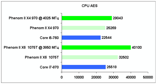 В CPU AES ситуация практически полностью повторяет таковую в прошлом тесте, но толку от HT уже совсем немного. Lynnfield, в отличие от более новых процессоров Intel, не поддерживают инструкции шифрования AES-NI, которые в данном тесте обычно дают шокирующее преимущество.