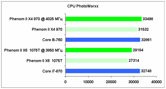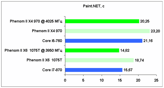 Pdnbench организован так, что HT здесь работает очень хорошо, но при разгоне шестиядерный процессор всё же оказывается чуть быстрее, чем i7-870. При этом Phenom II x4 970 BE показывает самый худший результат.
