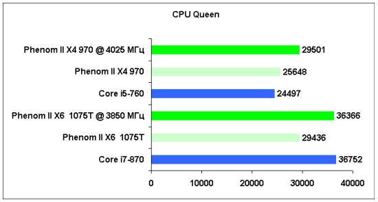Этот тест распараллеливается достаточно плохо, поэтому Phenom II X4 970 BE оказывается быстрее Phenom II X6 1075T. Притом специфика нагрузки такова, что Turbo Core не срабатывает, и разница в результатах, демонстрируемых процессорами одной марки, соответствует разнице в их тактовых частотах.
