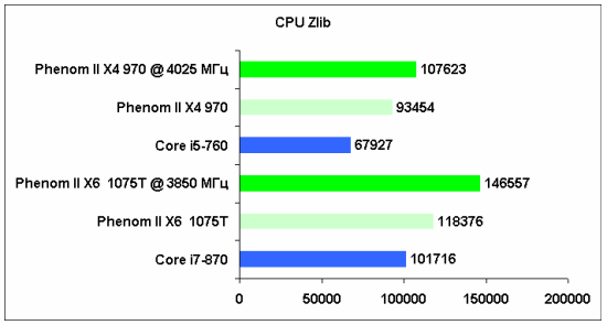 ZLib, напротив, распараллеливается практически идеально по физическим ядрам, да и эффект от Hyper Threading весьма значителен. Кстати говоря, процессоры AMD здесь обгоняют своих более дорогих конкурентов.
