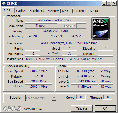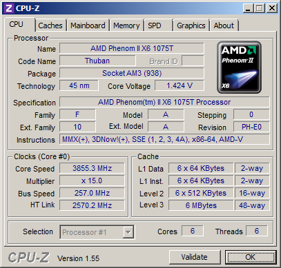 Вторая из рассматриваемых моделей также не преподносит нам особенных сюрпризов. Основой его является кристалл Thuban, рабочая частота составляет 3 ГГц (15 x 200 МГц), как раз между 1055T и 1090T. Те же 6 МБ разделяемой кэш-памяти L3, никаких изменений.