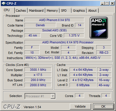 Такой пассаж про маркетинговые ходы компании обусловлен тем, что про сами процессоры особо ничего нового сказать не получится. 970 BE – тот же 965 BE с незначительно возросшей частотой. Результат в 3500 МГц был достигнут за счет увеличения множителя на 0,5 – до 17,5. Зачастую выход новой топовой модели знаменует собой переход на новый степпинг, но не в данной ситуации – перед нами все тот же RB-C3, который был внедрен AMD в конце 2009 года. Рабочее напряжение удалось сохранить на прежнем уровне – порядка 1,4 В.