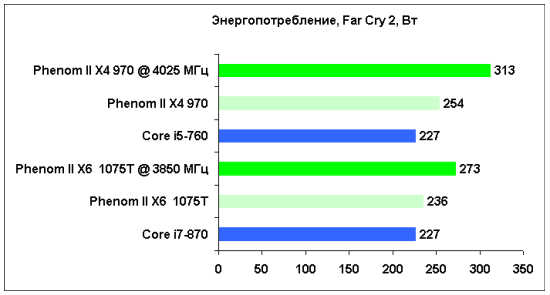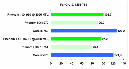 Far Cry 2 существенно быстрее работает на процессорах Intel, при этом данная игра не оптимизирована под большое количество вычислительных ядер, поэтому Phenom II X4 970 BE оказывается быстрее Phenom II X6 1075T.