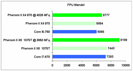 В тесте FPU Mandel наблюдается практически полный паритет между Intel и AMD. Шестиядерная модель значительно быстрее четырехядерной, и разгон только увеличивает это преимущество.