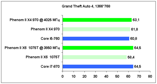 В Grand Theft Auto все протестированные процессоры показывают близкие результаты, но после разгона шестиядерный Phenom догоняет Core i7-870.