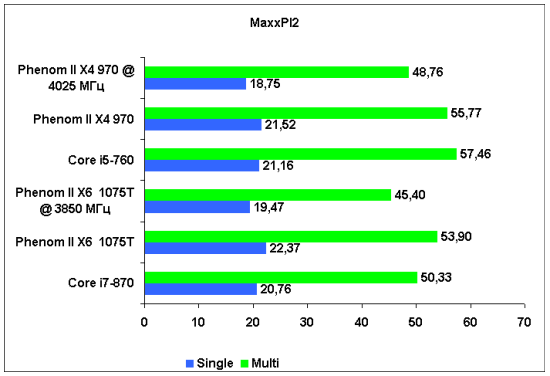 Известное развлечение – посчитать число «пи» с заданной точностью как можно быстрее. На этот раз мы используем числовую «молотилку» MaxxPI2, которая позволяет считать как в однопоточном, так и в многопоточном режимах. В этом тесте результат тем лучше, чем меньше значение.