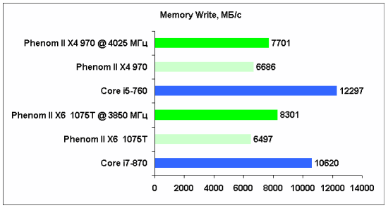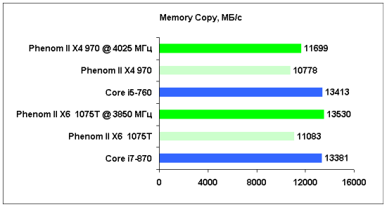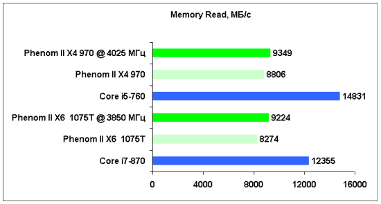Все тестируемые процессоры работают с двухканальным контроллером памяти, но модели от Intel справляются здесь существенно лучше. Впрочем, эти значения мало сказываются на реальной производительности системы. Phenom II X4 970 BE работает несколько быстрее, чем Phenom II X6 1075T. Видимо, дело в более высокой тактовой частоте.