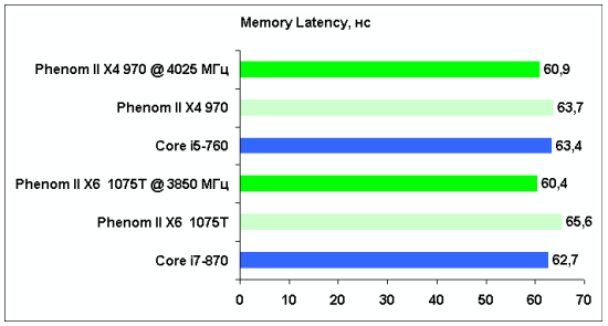 В тесте латентности процессоры показывают близкие результаты. После разгона модели от AMD немного вырываются вперед. Лидерство снова за Phenom II X6 1075T.