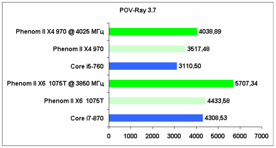POV-Ray использует алгоритмы ray-tracing, и оба процессора семейства Phenom здесь обгоняют конкурирующие модели.