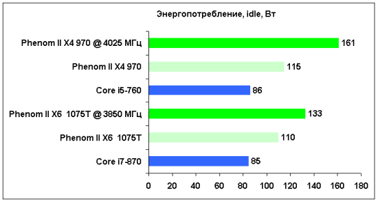Энергопотребление – сильная сторона современных платформ Intel. Так что процессорам AMD здесь приходится конкурировать только друг с другом. Отметим, что шестиядерный Phenom II X6 1075T оказывается немного экономичнее, чем четырехъядерный Phenom II X4 970 BE.
