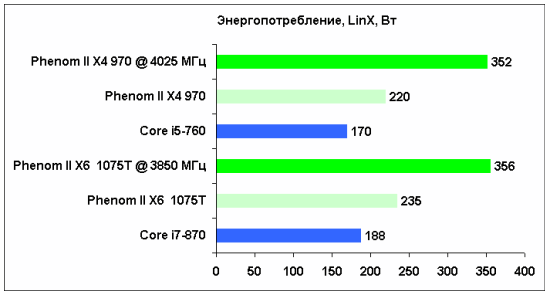 Под нагрузкой ситуация меняется, шестиядерный процессор всё же потребляет несколько больше энергии, несмотря на меньшую рабочую частоту. Выравниваются даже значения энергопотребления для разогнанных систем, где ранее Phenom II X4 970 BE за счет более высокого напряжения питания потреблял больше энергии.