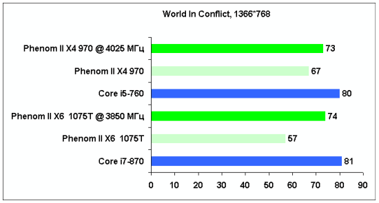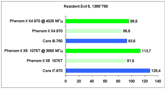 Известный хоррор явно импонирует процессорам от Intel, притом разница между i5-760 и i7-870 оказывается просто-таки огромной. Процессорам от AMD здесь не помогает даже разгон. Заметно, что игра «понимает» наличие у Phenom II X6 1075T шести процессорных ядер.