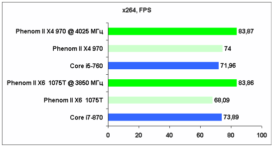 Еще один тест, хорошо относящийся к технологии HyperThreading. Ни одному процессору AMD не удается догнать Core i7-870 даже с учетом разгона.