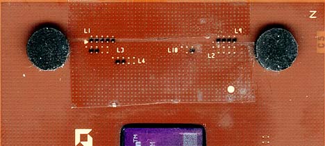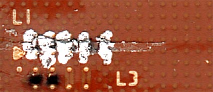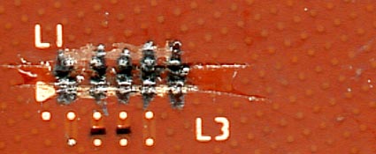 Сейчас вам следует убрать пленку, и вы получите достаточно хорошее соединение. Выполняйте аналогичную процедуру для каждой оставшейся пары контактов, до тех пор, пока все мостики L1 не будут замкнуты. Далее измерьте сопротивление получившихся мостиков (от нижнего контакта к верхнему). Сопротивление должно приближаться к 0 Ом! Проверьте еще раз, не произошло ли случайного соединения соседних мостиков между собой. Если вы обнаружите такое соединение, его следует аккуратно разомкнуть, используя скальпель. При измерении сопротивления не давите сильно на щуп, иначе вы можете сколупнуть лак.