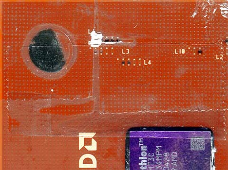 Соединение карандашом с Athlon XP больше не работает. Рядом показано увеличенное изображение мостиков. Но сопротивление таких мостиков слишком велико, поэтому такое соединение не действует. Как мы уже говорили, сопротивление мостика превышает 1 кОм, и по нему не идет ток. На старом же Athlon Thunderbird сопротивление между нижними контактами L1 и землей было близко к бесконечности, поэтому ток все же проходил по графитовым мостикам.