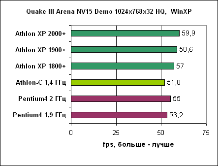 В Demo001 в обоих разрешениях Pentium 4 2 ГГц остался лидером, хотя разница между ним и Athlon XP 2000+ настолько сократилась, что ее можно не замечать. В NV15 Athlon XP 2000+, как обычно, вышел победителем.