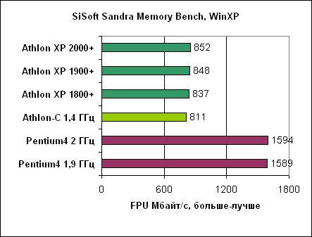В тестировании SiSoft Sandra 2001 мы видим, что кроме теста пропускной способности памяти, где Pentium 4 2 ГГц все еще непобедим, AMD XP 2000+ находится "на высоте". По каким-то причинам Athlon-C 1400 в тесте памяти показывает лучшие результаты, нежели семейство Athlon XP.